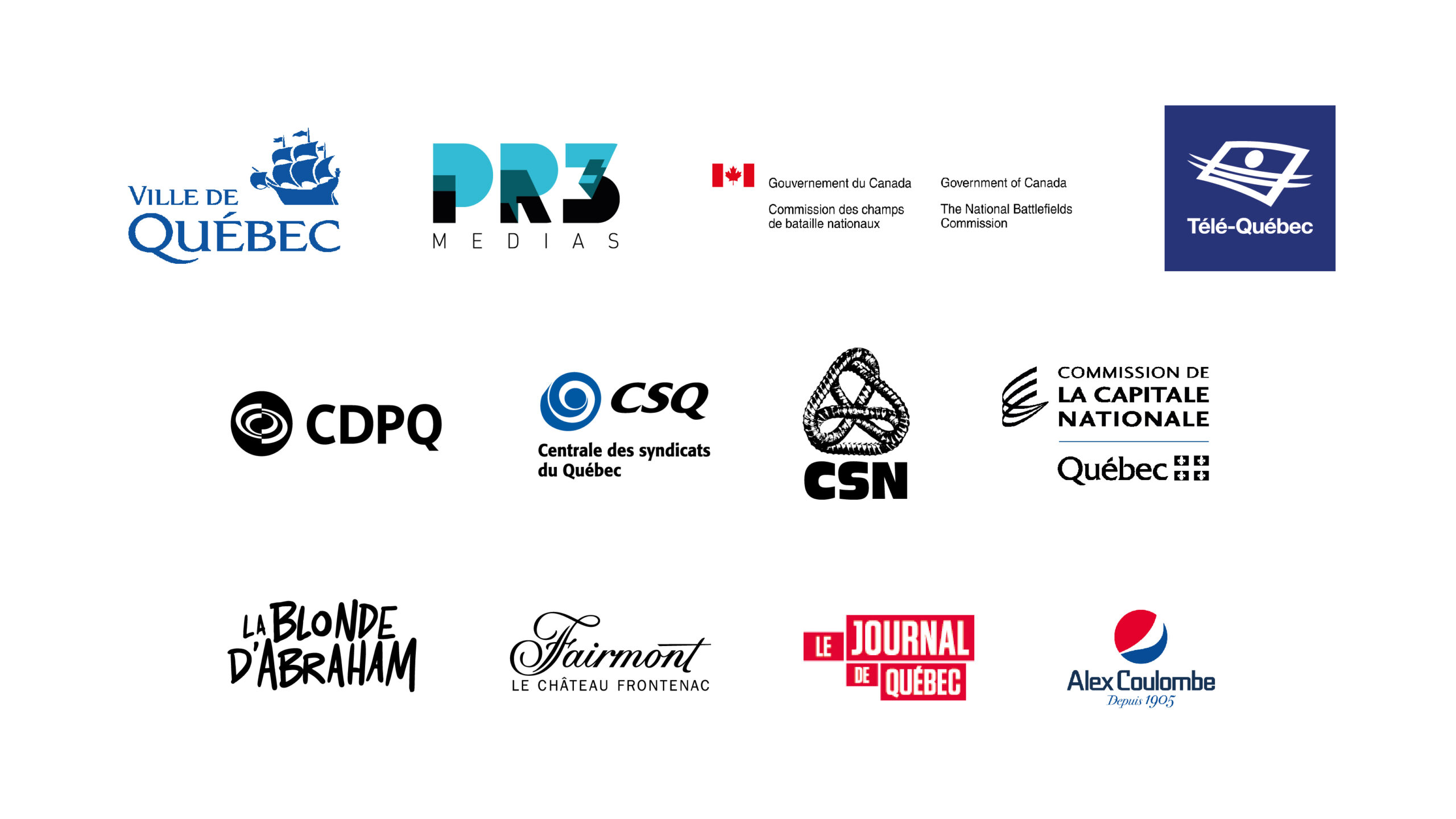 Nous remercions également la Ville de Québec, le Secrétariat à la Capitale-Nationale du Québec, les neuf microbrasseries du Collectif des brasseurs de la Capitale, la Commission des champs de bataille nationaux, la Commission de la capitale nationale du Québec, la Centrale des syndicats du Québec (CSQ), la Caisse de dépôt et de placement du Québec (CDPQ), la Confédération des syndicats nationaux (CSN), Destination Québec cité, Hoppin et PR3 médias à titre de partenaires de la Fête nationale dans la capitale. Merci également à nos collaborateurs, le Fairmont Le Château Frontenac et le Château Laurier, partenaires hôteliers, Pepsi Alex-Coulombe, Accent bleu du Québec, le Journal de Québec, le Musée de la civilisation et le Comité de la Fête nationale de Montréal.